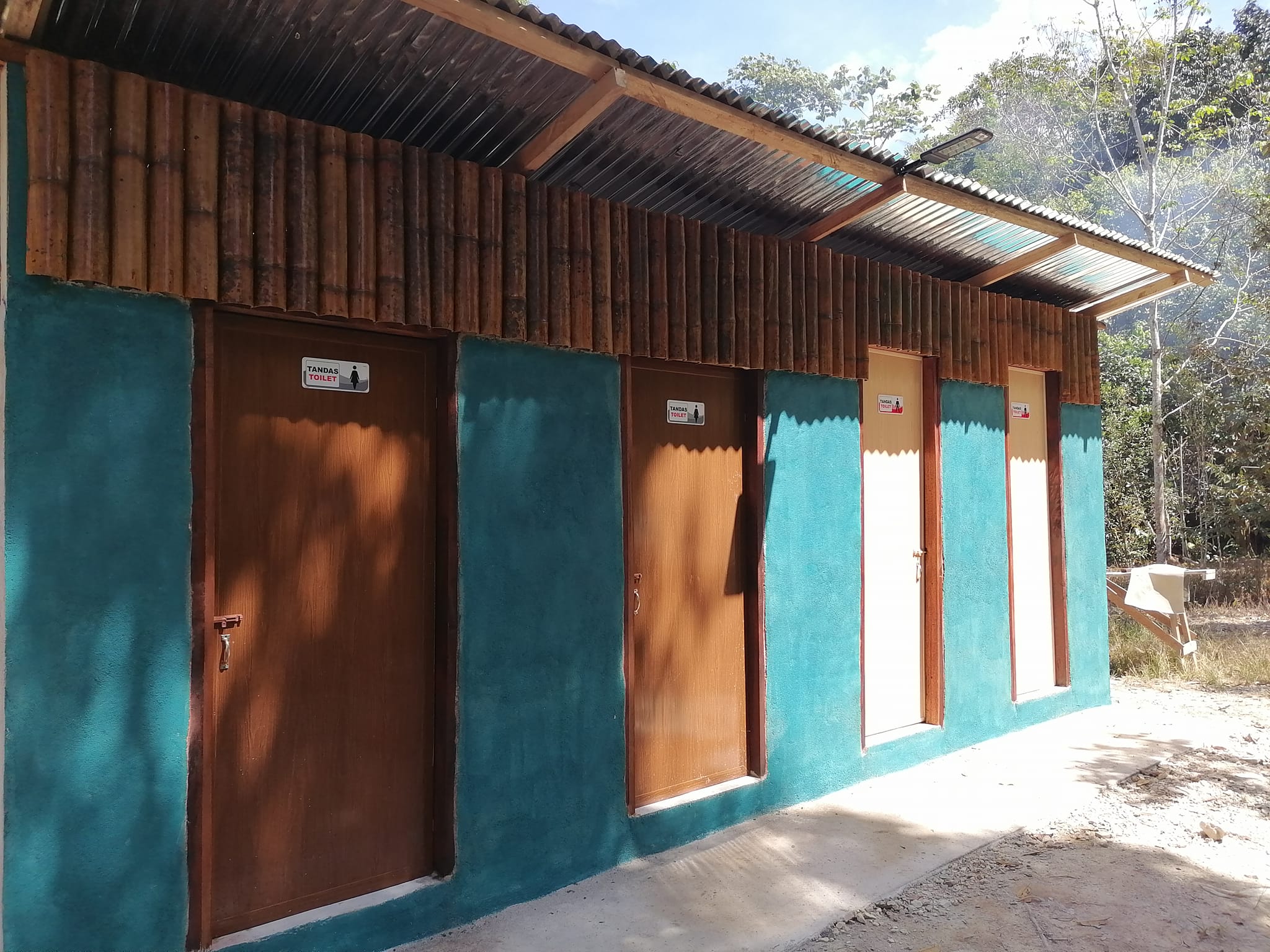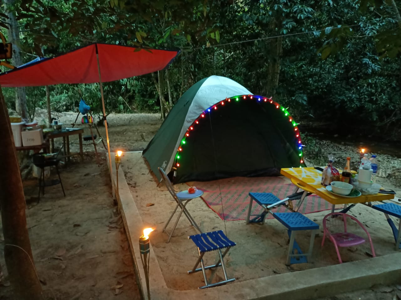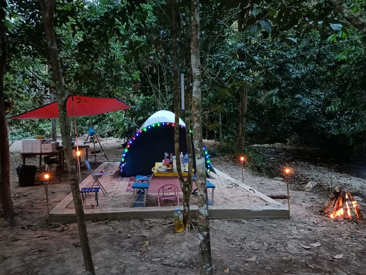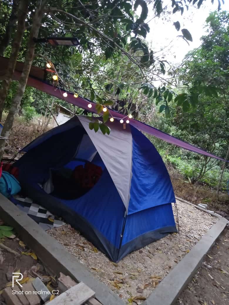 Tapak camping dalam dusun buah-buahan tepi sungai.